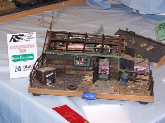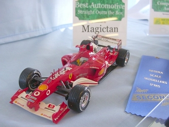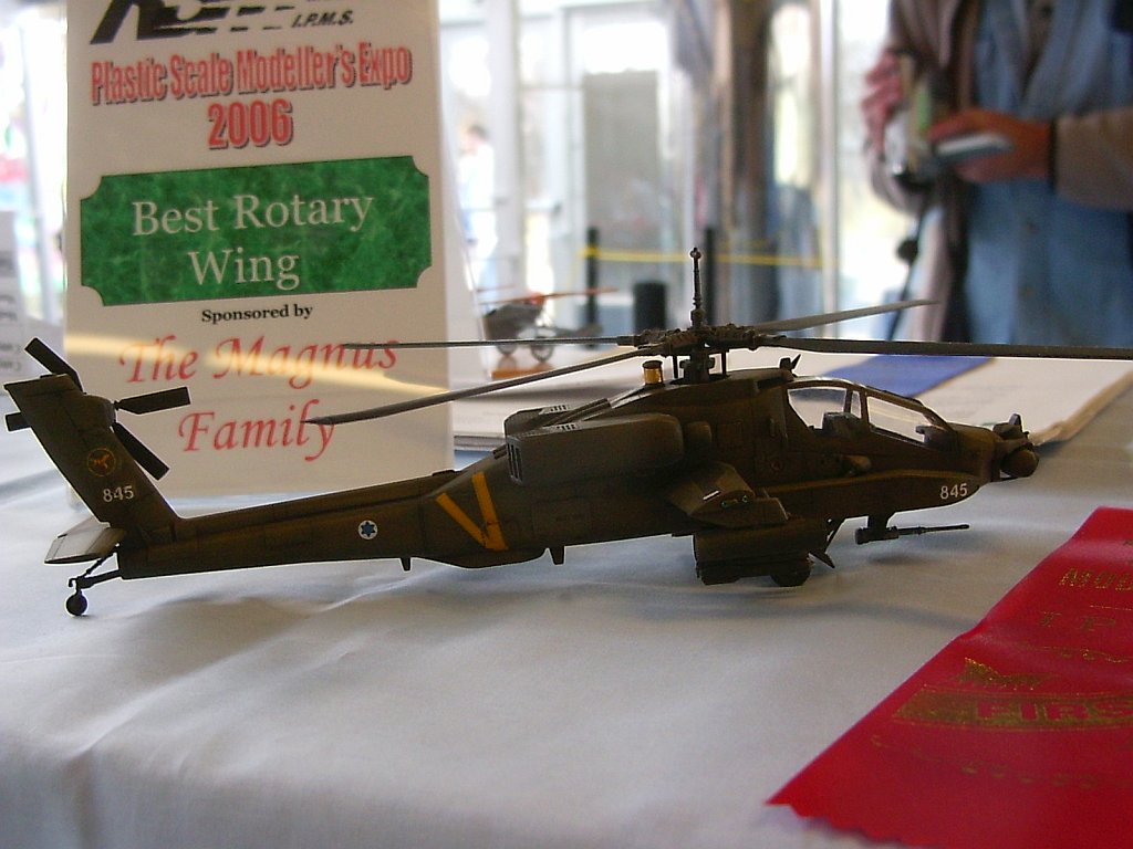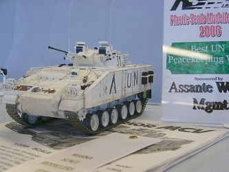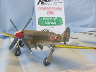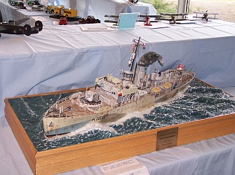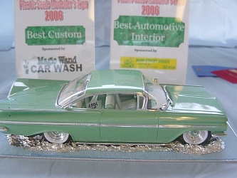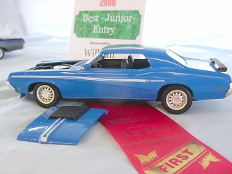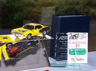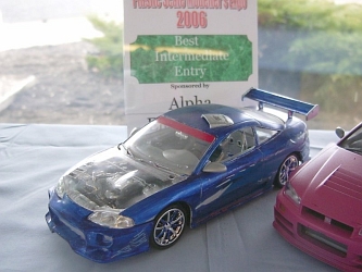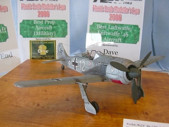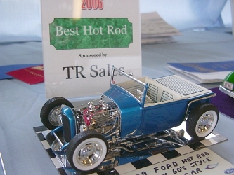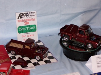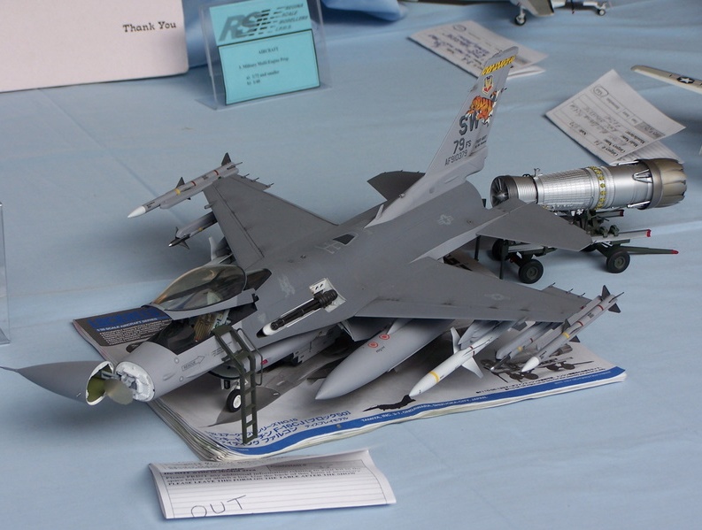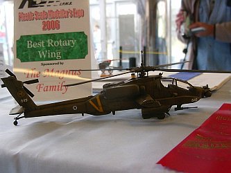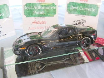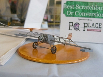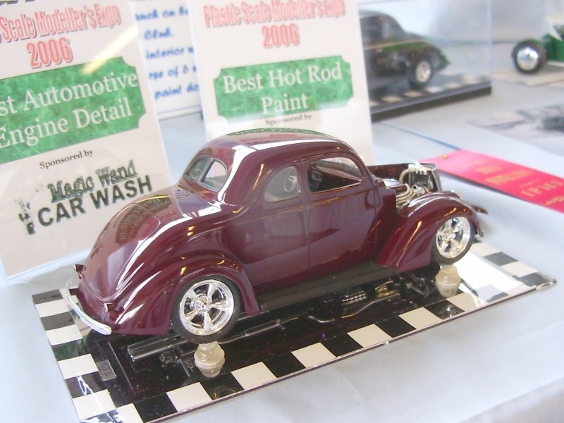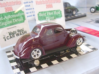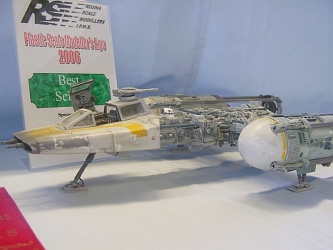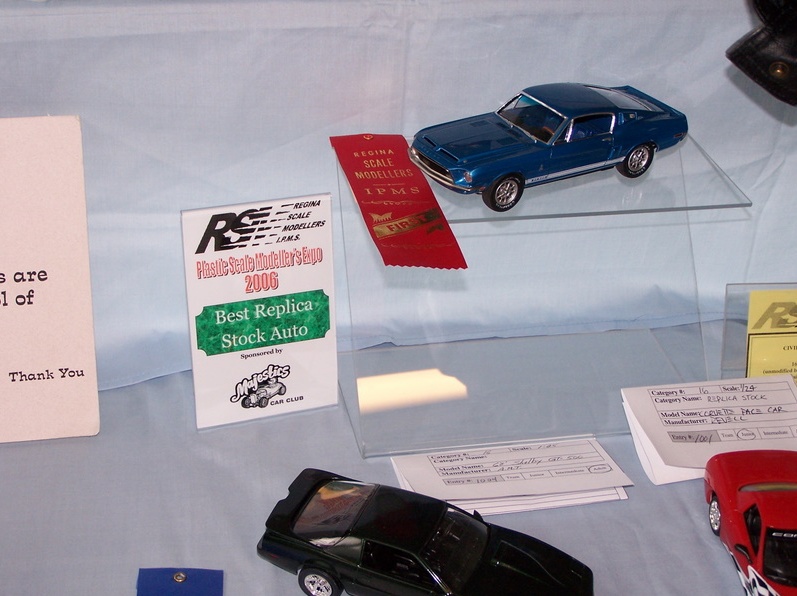 AIRCRAFT 1. Military Biplane (and others that are predominately fabric, strut, and rigging) b) larger than 1/72: 1st: Siemens Shuckert, Dave Porter 2. Military Single Engine Prop a) 1/72 and smaller: 1st: P-51D, Murray Kish b) 1/48: 1st: Fw-190 A-3, Jeff Betcher, 3. Military Multi-engine Prop a) 1/72 and smaller: 1st: B-17F, Mike Reid b) 1/48: 1st: Me-410, Lee David 4. Large Scale, 1/35 and larger: 1st: F-16C, Joey Stebanuk 5. Military Single Engine Jet or Rocket a) 1/72 and smaller: 1st: Me-163 Komet, Al Magnus b) 1/48: 1st: F-84, Lee David 6. Military Multi-engine Jet or Rocket a) 1/72 and smaller: 1st: Mig-25, Dave Porter b) 1/48: 1st: F-14B, Colin Kunkel 7. Airliners and Civilian Cargo a) Less than 1/72: 1st: Spruce Goose, Gene Stacyszyn 8. Civil - sport, stunt, gliding, experimental and racing less than 1/35: 1st: Curtiss Racer, Daved Porter 9. Rotary wing, less than 1/35: 1st: AH-64 Apache, Dave Porter MILITARY VEHICLES 10. AFVs (through 1945), including tanks, open top AFVs, assault guns and self-propelled guns (1/48 and larger): 1st: Wespe, Dave Porter 11. AFVs (post 1945), including tanks, open top AFVs, assault guns and self-propelled guns (1/48 and larger): 1st: Sturm 103C, Cam Barker 12. Half-tracks and armoured cars (all eras) 1/48 and larger: 1st: ½ track Motor Team, Brian Lloyd 13. All other military vehicles (all eras, including jeeps, trucks, motorcycles, etc.) 1/48 and larger: 1st: LTV-4 Water Buffalo, Cam Barker 14. Artillery, all eras, towed, 1/48 and larger (includes missiles, rockets, and railroad guns (all scales): 1st: Sig 33 Artillery, Brian Miller 15. Military vehicles, missiles, rockets, etc. (all eras) 1/49 and smaller (except railroad guns - see Cat. #14): 1st: SA-2 Guideline, Al Magnus CIVILIAN AUTOMOTIVE 16. Replica stock (unmodified body, chassis, factory wheels and drive train, includes conversions) 1/20 and smaller : Junior: 1st: Corvette Pace Car, Robert Gall Adult: 1st: Shelby GT500, Jeff Turlock 17. Street Modified & Pro Street (1/20 and smaller): Junior: 1st: Mercury Cougar, Joshua Betcher Intermediate: 1st: Mitsubishi Eclipse, Michael Phillips Adult: 1st: 2006 Corvette, Larry Draper 18. Competition, open wheel (1/20 and smaller) 18a:Road or Oval: 1st: Honda F1, Jeff Turlock 18b: Drag: 1st: Black Widow Bantam, Larry Draper 19. Competition, closed wheel (1/20 and smaller) 19a: Straight Line (Drag & Bonneville): 1st: Dodge Colt Dragster, William Yee 19-b: Road Race: 1st: Greenwood Vette, Larry Draper 19c: Stock Car: 1st: Kraft Taurus, Ron Gall 20. Custom and Show cars (1/20 and smaller) 1st: '59 Chev, Ed Kereluk 21. Street Rods (1/20 and smaller) 1st: '37 Ford Coupe, Ed Kereluk, 22. Public Service Vehicles (e.g. taxis, police, fire, utility, tow trucks, etc.) (1/20 and smaller) 1st: LaFrance Fire Truck, Mike Strauch 23. Light trucks (1/20 and smaller) 1st: '50 Chev, Leith James 25. Motorcycles, all scales: 1st: Honda NSR500, Murray Kish 26. Large scales (1/19 and larger): 1st: '65 Vette, All Lindemann 27. Muscle Cars 1960-1975 (1/20 and smaller): 1st: Hemi Cuda, Jeff Turlock SPACE & SCI-FI 29. Film and TV spacecraft and vehicles (kits and scratchbuilts): Junior: 1st: Tie Fighter, Nathan Betcher Adult: 1st: Star Wars Y-Wing, Dave Porter 30. Fiction/Fantasy spacecraft and vehicles (kits and scratchbuilts): 1st: Post WW3 '58 Chevy ½ Track, Ron Gall SHIPS 32. Powered (surface): b) 1/400 and larger: 1st: RCN Flower Class Corvette, Michael Evans, 33. Submarines: b)1/400 and larger: 1st: Type VIIC U-boat, Michael Evans FIGURES 34. Military, all scales: 1st: British Motorcycle Despatch Rider, Brian Miller 36. Sci-Fi/Fantasy, all scales: 1st: Bandai Buster Gundam, Ron Gall DIORAMAS 39. Aircraft a) Small composition (single aircraft), all scales: 1st: Mirage III, Randy Lukian 40. Military vehicles a) Small composition (single vehicle) 1/48 and larger: 1st: M26, Cam Barker b) Large composition (2 or more vehicles) 1/48 and larger: 1st: Eastern front Diorama , Michael Evans 41. Civilian Automotive: 1st: "Where's Spike", Randy Lukian 44. Miscellaneous dioramas- 1st: Apollo Command Module & Lander, Randy Lukian MISCELLANEOUS 45. Collections (5 or more), all scales: 1st: US Design Series - Missiles, Rockets & Drones, Al Magnus 46. Miscellaneous: Anything that does not fit in any other category: - 1st: Frankie's Fliver, Dave Kapp