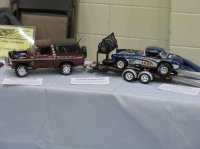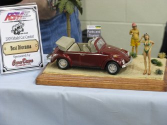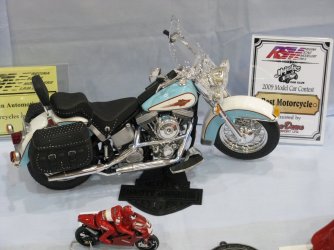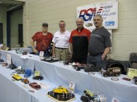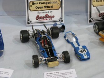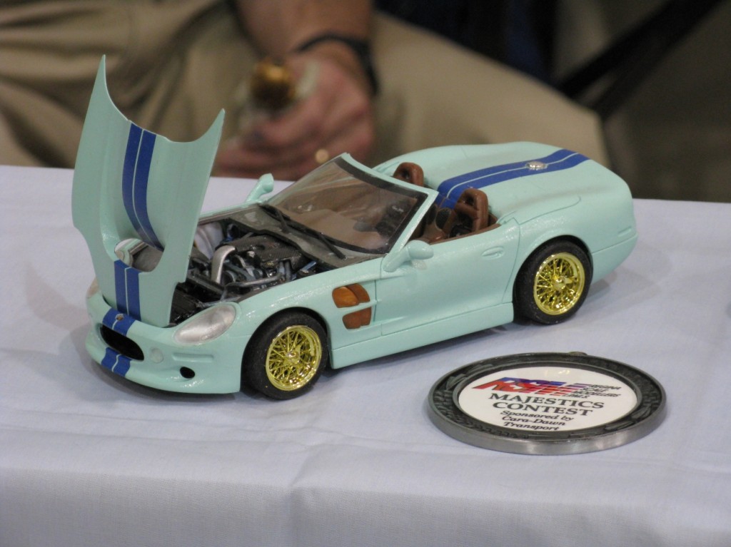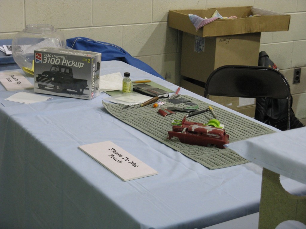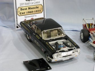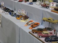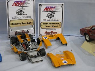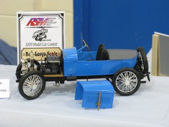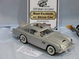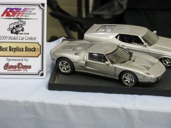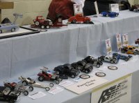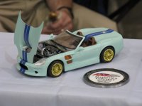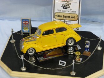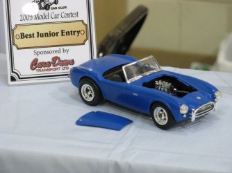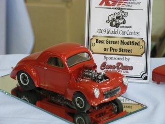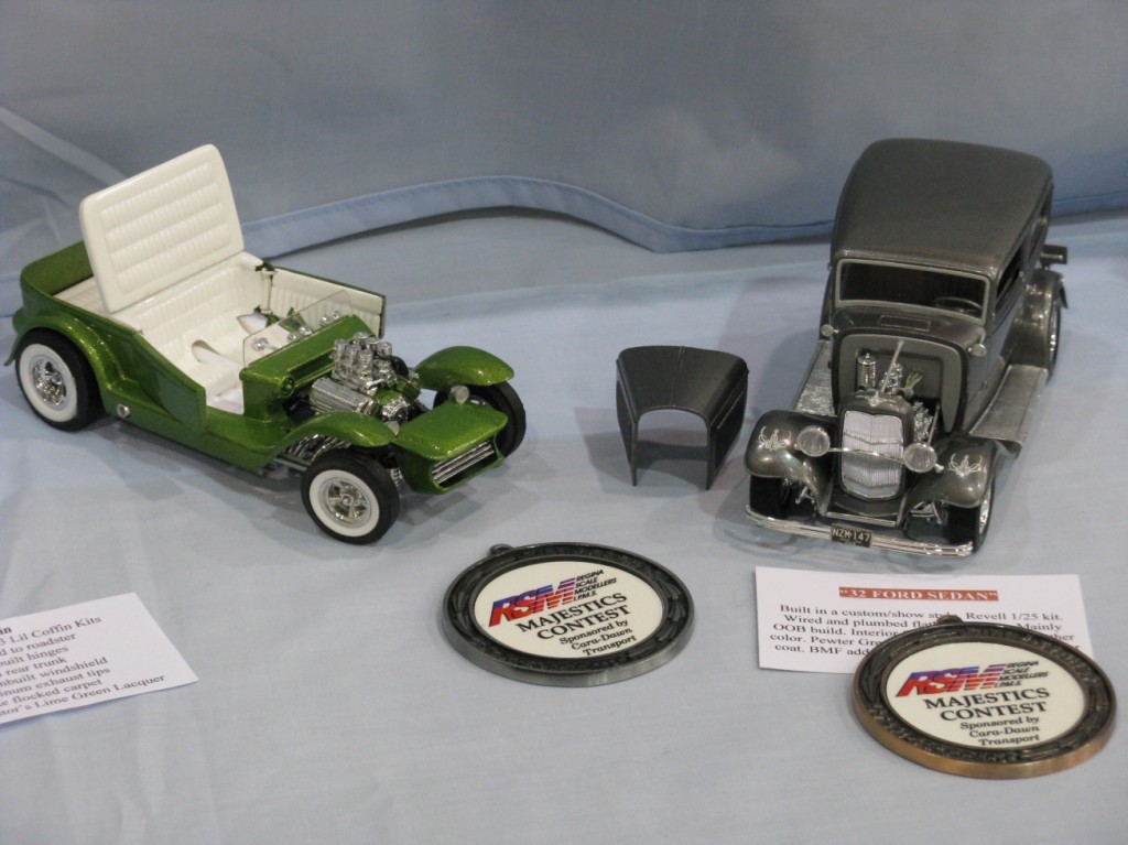 Category 1 Street Rods 1. Evan Hanson - Revell 1/25 scale 1937 Ford Street Rod 2. Dave Kapp - Monogram 1/25 scale Open Coffin Custom 3. Greg McKinnon - Revell 1/25 scale '32 Ford Sedan Category 2 Custom & Show cars 1. Dave Kapp - Aurora 1/25 scale Aston Martin DB-5 2. Dave Kapp - Monogram 1/24 scale Fast Buck 3. Dave Kapp - Polar Lights Wolfman's Wagon Category 3 Motorcycles 1. Dave Kapp - Revell 1/8 scale 2002 Harley Davidson 2. Curfew James - Heller 1/24 scale Ducati "Desmosedici" Category 4 Large Scale 1. Curfew James - Minicraft 1/16 scale 1919 Hispano-Suiza "Alfonso" 2. Allen Lindemann - MPC 1/16 scale '78 Corvette 3. Curfew James - Lindberg 1/8 scale Budget T Rat Rod Category 5 Muscle Cars 1. Curfew James - Revell 1/25 scale 1964 Fairlane Thunderbolt Category 6 Replica Stock: 1. Robert Gall - AMT 1/25 scale Shelby Cobra 289 (Junior entry) 1. Ron Gall - Polar Lights 1/24 scale Ford GT 2. Evan Hanson - AMT 1/24 scale 1957 Ford Fairlane Category 7 Competition Open Wheel 1. Dave Kapp - AMT 1/25 scale Olsonite Eagle 2. Curfew James - Monogram 1/24 scale Modified Racer with Trailer 3. Greg McKinnon - AMT 1/25 scale Fiat AA/FA Category 8 Competition Closed Wheel 1. Dave Kapp - Accurate Miniatures 1/25 scale McLaren M8B 2. Greg McKinnon - Revell 1/25 scale 1941 Willys "Big John MacManian" 3. Greg McKinnon - Revell 1/25 scale 1941 Willys Gasser "Skull" Category 9 Street Modified or Pro Street 1. Ron Gall - Revell 1/24 scale 1941 Willys 2. Ted McPherson - Revell 1/25 scale Shelby Series 1 3. Ron Gall - AMt/Polar Lights 1/24 scale '71 Ford Mustang GT Category 12 Trucks 1. Greg McKinnon - AMT 1/25 scale Ford Snow Plow 2. Ted McPherson - Revell 1/25 scale 1941 Chevrolet Pickup 3. Ted McPherson - Revell 1/25 scale 1937 Ford Panel Delivery