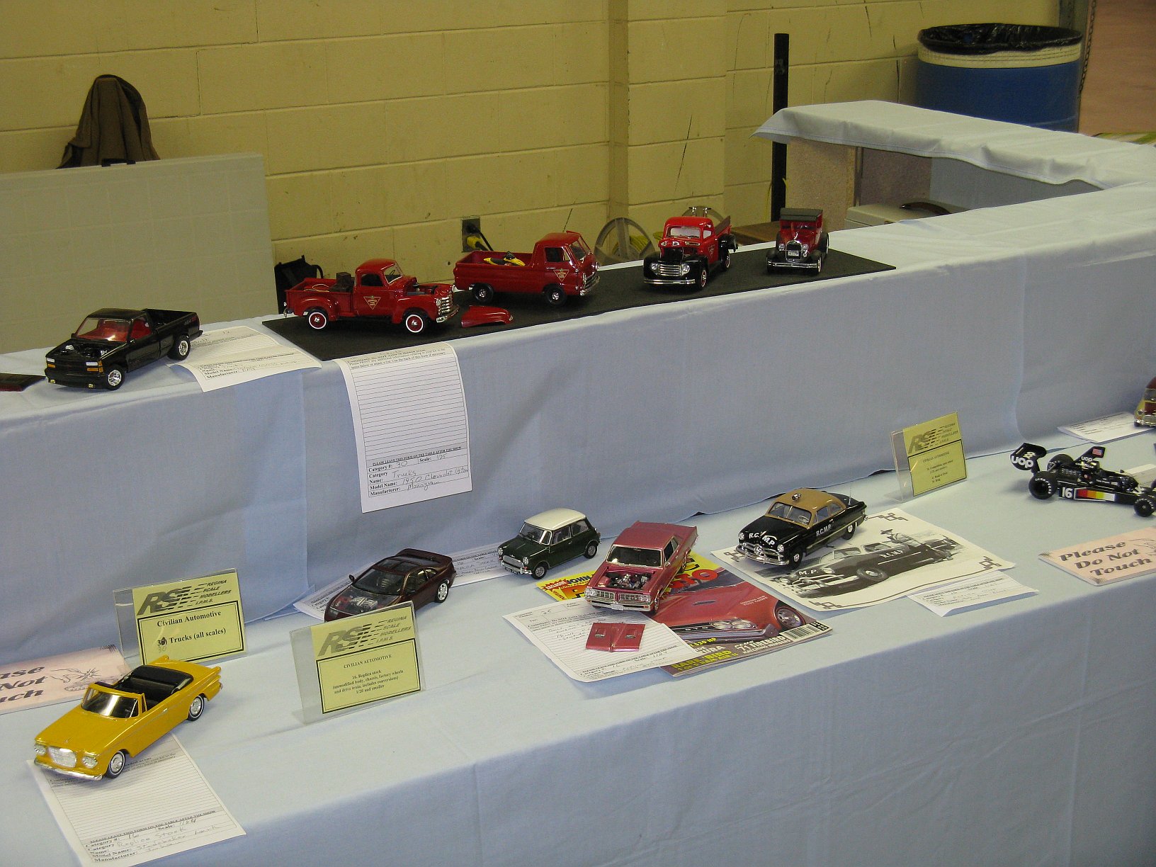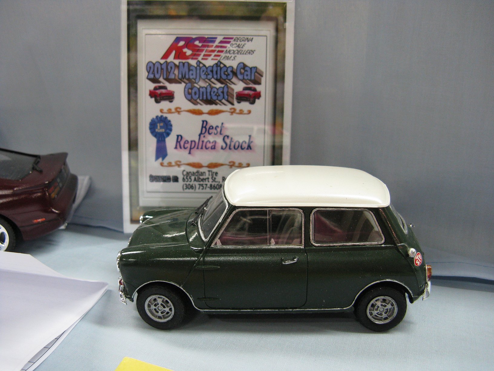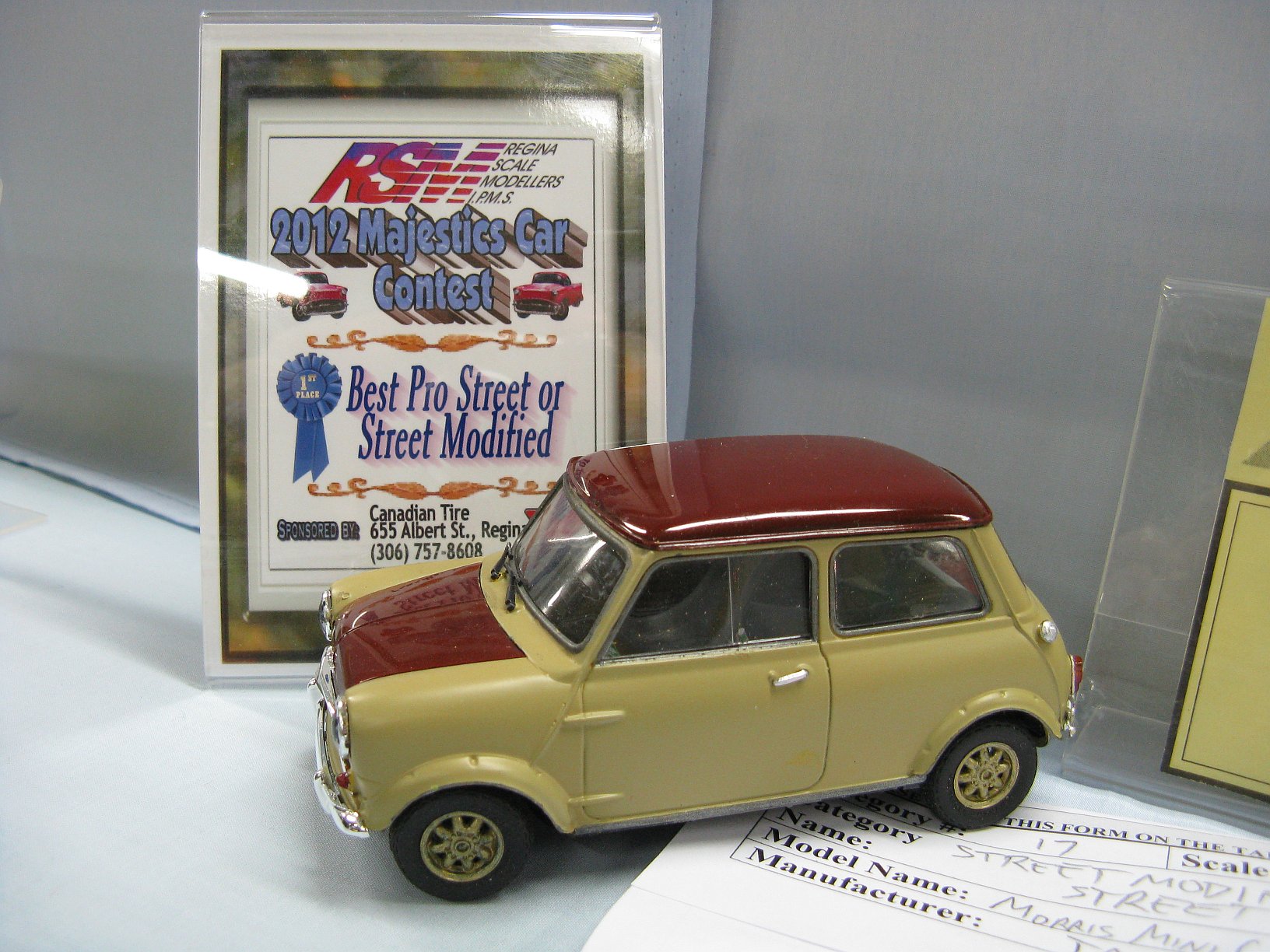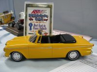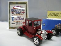 Category 16: Replica Stock 1st - Morris Mini Cooper 1275S Mk.1 Ted McPherson 2nd - Lotus Super 7 Brian Miller 3rd - 1949 Ford RCMP Dave Schmidt Category 17: Street Modified & Pro Street 1st - Morris Mini Cooper Racing Ted McPherson 2nd - '57 Chevrolet Bel Air Justin Antonowitsch Category 18: Competition Open Wheel 1st - Shadow DN5 (1975) Dave Porter 2nd - Swamp Rat Dave Kapp Category 19: Competition Closed Wheel 1st - Blue Max Funny Car Dave Kapp 2nd - Porsche 911 GT1 "EVO" Ted McPherson 3rd - Toyota Celica 93 Monte Carlo Rally Car Ted McPherson Category 20: Custom & Show cars 1st - '54 Mercury Dave Kapp 2nd - Chrysler Atlantic Dave Schmidt 3rd - Tijuana Taxi Dave Kapp Category 21: Street Rods 1st - '21 Tee Dave Kapp 2nd - 1912 T Truck Dave Kapp 3rd - '29 Woody Dave Kapp Category 25: Motorcycles 1st - Gambler Custom Chopper Brian Miller Category 26: Large Scales 1st - Mercedes Racer Brian Miller 2nd - 1969 Toyota 2000 GT Al Lindemann Category 27: Muscle Cars 1st - '62 Chevrolet Bel Air 409 Justin Antonowitsch Category 30A: Light Trucks 1st - 1950 Chev Half Ton Curfew James 2nd - Chevrolet 454SS Pickup Justin Antonowitsch Category 30B: Heavy Trucks 1st - Ford Snow Plow Justin Antonowitsch 2nd - Mack Concrete Mixer Harvey Ferguson 3rd - Kenworth Dump Truck David Oancia Category 47: Dioramas 1st - Abandoned Chev Impala Michael Evans 2nd - Ranchero Rest Inn Evan Hanson