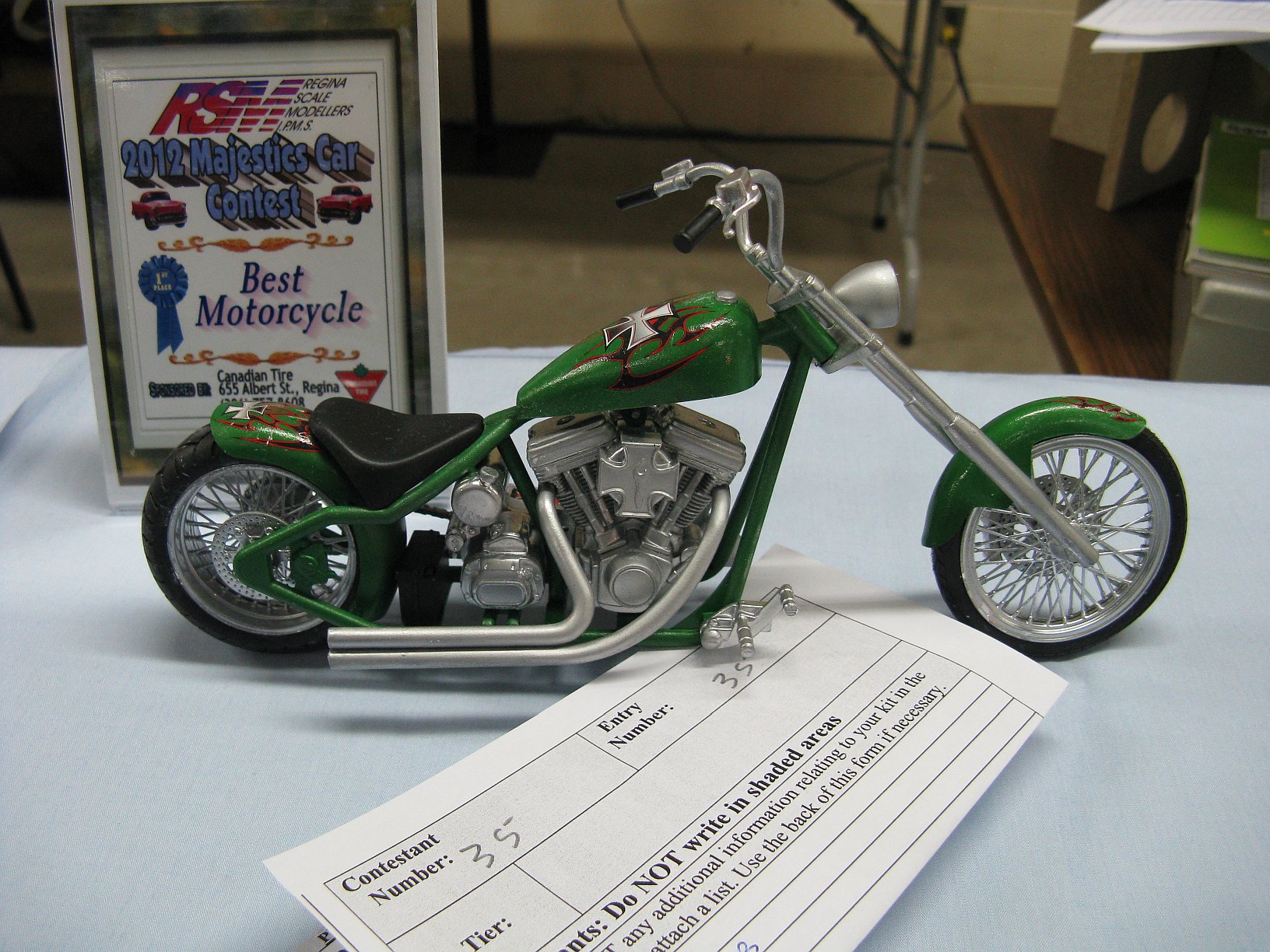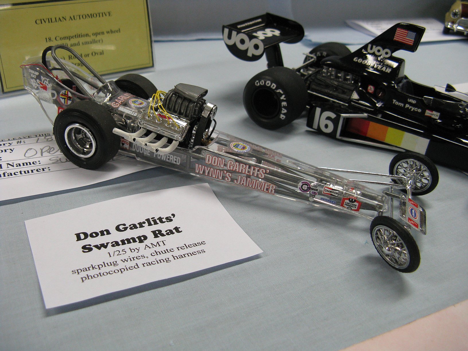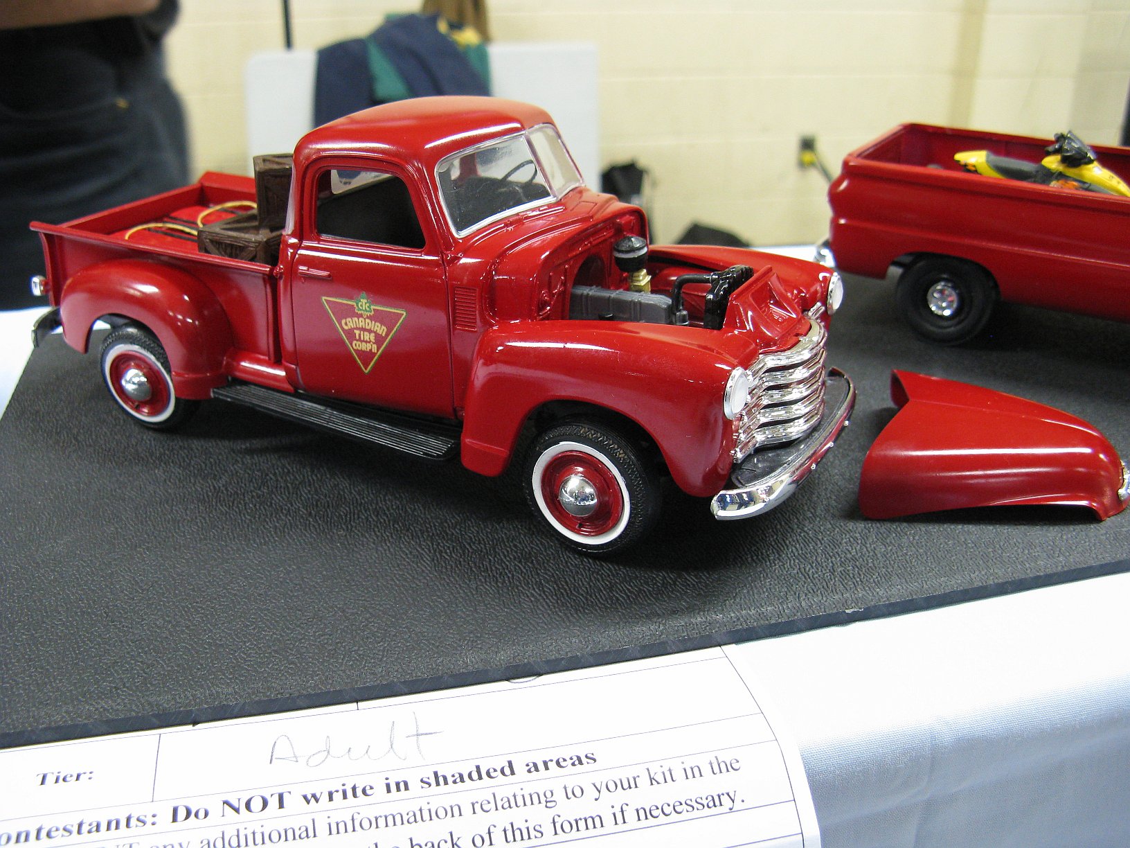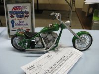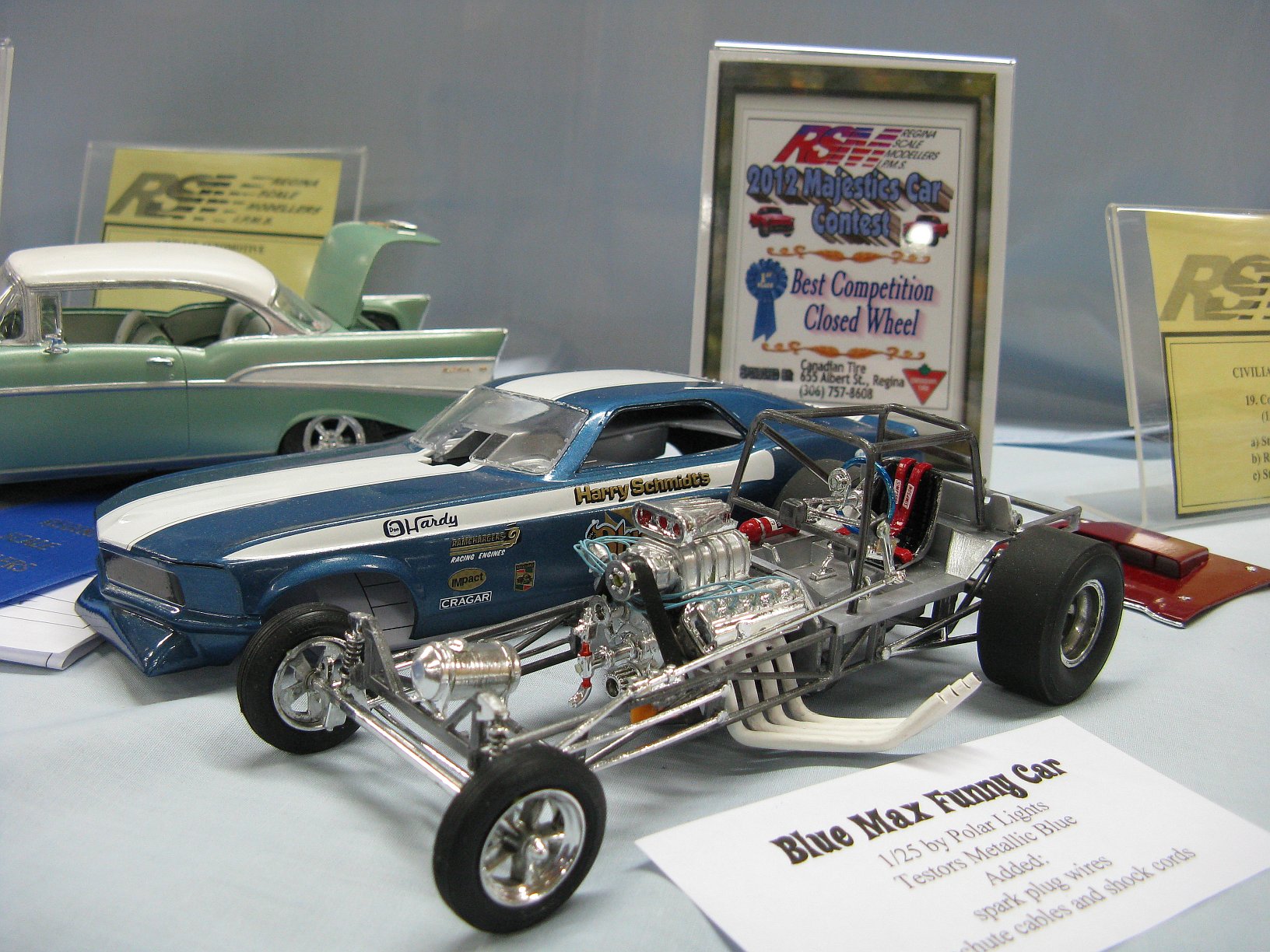 Category 16: Replica Stock 1st - Morris Mini Cooper 1275S Mk.1 Ted McPherson 2nd - Lotus Super 7 Brian Miller 3rd - 1949 Ford RCMP Dave Schmidt Category 17: Street Modified & Pro Street 1st - Morris Mini Cooper Racing Ted McPherson 2nd - '57 Chevrolet Bel Air Justin Antonowitsch Category 18: Competition Open Wheel 1st - Shadow DN5 (1975) Dave Porter 2nd - Swamp Rat Dave Kapp Category 19: Competition Closed Wheel 1st - Blue Max Funny Car Dave Kapp 2nd - Porsche 911 GT1 "EVO" Ted McPherson 3rd - Toyota Celica 93 Monte Carlo Rally Car Ted McPherson Category 20: Custom & Show cars 1st - '54 Mercury Dave Kapp 2nd - Chrysler Atlantic Dave Schmidt 3rd - Tijuana Taxi Dave Kapp Category 21: Street Rods 1st - '21 Tee Dave Kapp 2nd - 1912 T Truck Dave Kapp 3rd - '29 Woody Dave Kapp Category 25: Motorcycles 1st - Gambler Custom Chopper Brian Miller Category 26: Large Scales 1st - Mercedes Racer Brian Miller 2nd - 1969 Toyota 2000 GT Al Lindemann Category 27: Muscle Cars 1st - '62 Chevrolet Bel Air 409 Justin Antonowitsch Category 30A: Light Trucks 1st - 1950 Chev Half Ton Curfew James 2nd - Chevrolet 454SS Pickup Justin Antonowitsch Category 30B: Heavy Trucks 1st - Ford Snow Plow Justin Antonowitsch 2nd - Mack Concrete Mixer Harvey Ferguson 3rd - Kenworth Dump Truck David Oancia Category 47: Dioramas 1st - Abandoned Chev Impala Michael Evans 2nd - Ranchero Rest Inn Evan Hanson