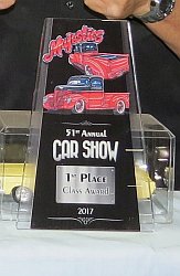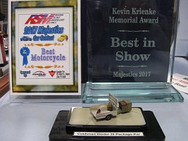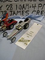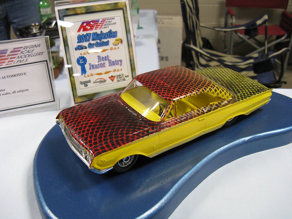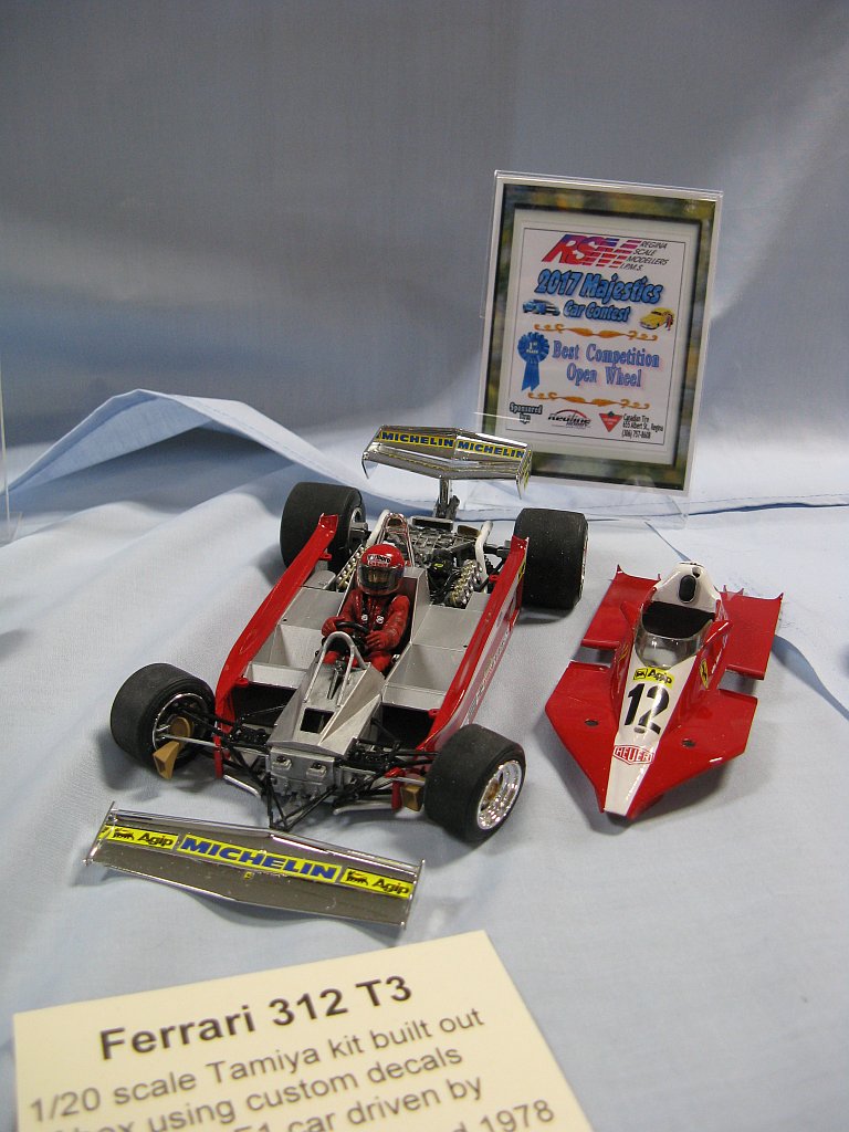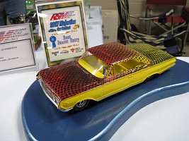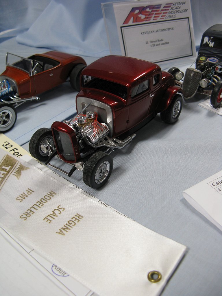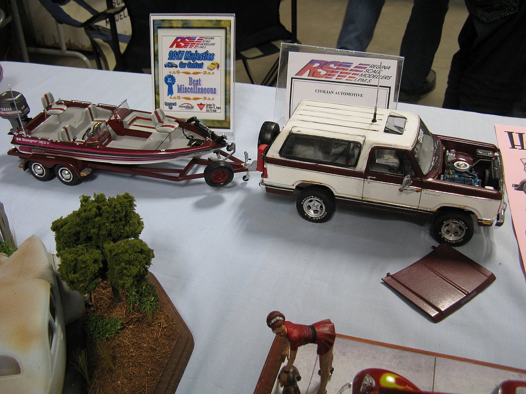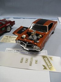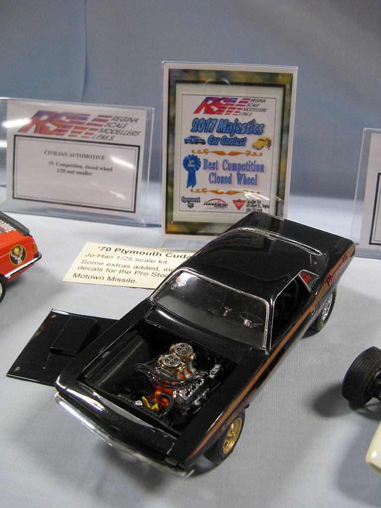 Category 16: Replica Stock 1st - Justin Antonowitsch - 1968 Volkwagen Beetle 2nd - Greg McKinnon - '69 Camaro Z/28 RS 3rd - Justin Antonowitsch - '83 Hurst Oldsmobile Category 17: Street Modified & Pro Street 1st - Greg McKinnon - '70 Camaro Z/28 Category 18: Competition Open Wheel (1/20 and smaller) 1st - Greg McKinnon - Ferrari 312T3 2nd - Ted McPherson - Honda R272 3rd - Dave Kapp - Tony Nancy Rail Category 19: Competition Closed Wheel 1st - Greg McKinnon - Motown Missile 2nd - Greg McKinnon - '69 Chevy Nova SS 3rd - Greg McKinnon - '70 Buick GSX Category 20: Custom & Show cars 1st - Brent Welta - '49 Ford Custom Coupe 2nd - Dave Kapp - Ice "T" 3rd - Dave Kapp - Sand Shark Category 21: Street Rods 1st - Greg McKinnon - '29 Ford Custom Pickup 2nd - Greg McKinnon - '29 Ford Roadster 3rd - Greg McKinnon - '32 Ford 5-window Coupe Category 23: Light Trucks 1st - Justin Antonowitsch - 1972 Ford F100 Sport Custom Category 24: Heavy Trucks 1st - Brian Lloyd - White Road Boss w. Trailer Category 25: Motorcycles 1st - Al Magnus - Cushman model 1939 Package-Kar Category 26: Large Scales 1st - Greg McKinnon - Foose '69 Camaro Z/28 2nd - Dave Kapp - Revellution Funny Car 3rd - Al Lindemann - 1982 Firebird Category 27: Muscle cars 1st - Darin Wielgoz - '70 Boss 429 Mustang 2nd - Darin Wielgoz - '64 Mustang Convertible 3rd - Darin Wielgoz - '69 Camaro Z/28 Category 34: Junior 1st - Mercury Kapp - Mercury Marauder Category 41: Dioramas (all scales) 1st - Brent Welta - Junkyard '40 Ford Coupe & '34 Ford Pickup 2nd - Michael Evan - '32 Ford Coupe Category 46: Miscellaneous (all scales) 1st - Justin Antonowitsch - 'Gone Fishing' set