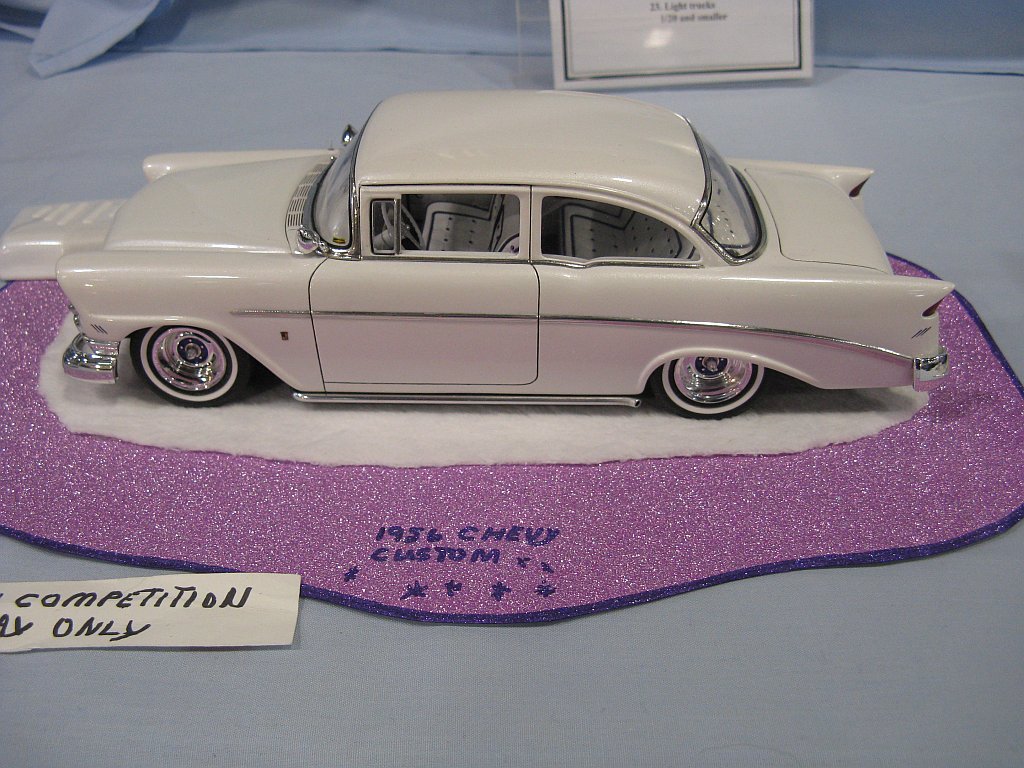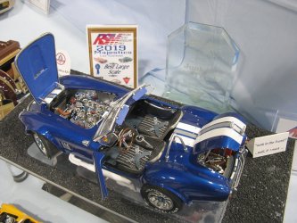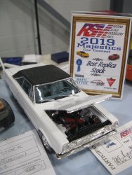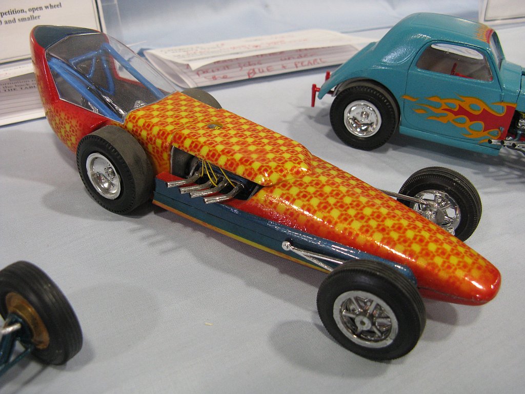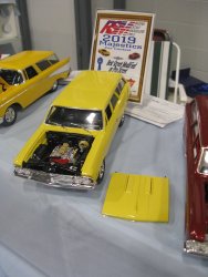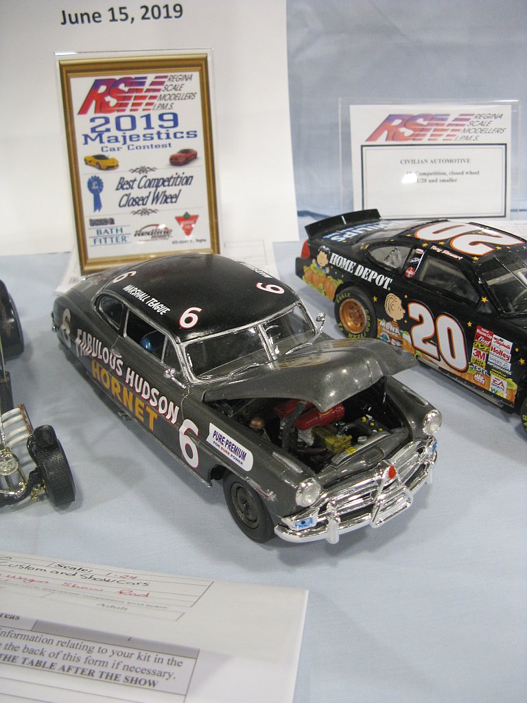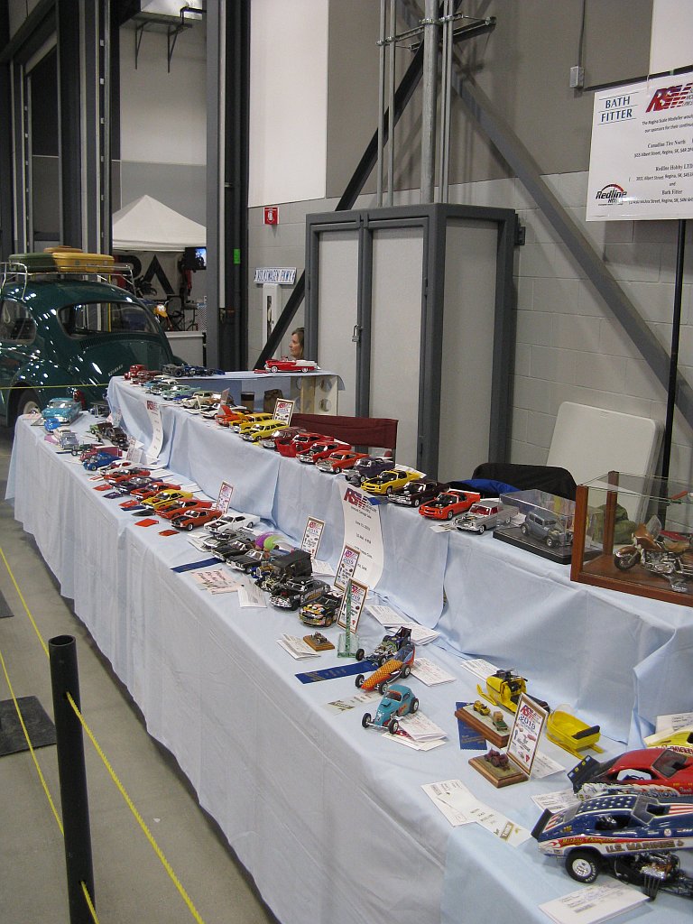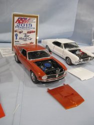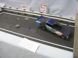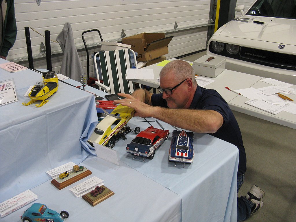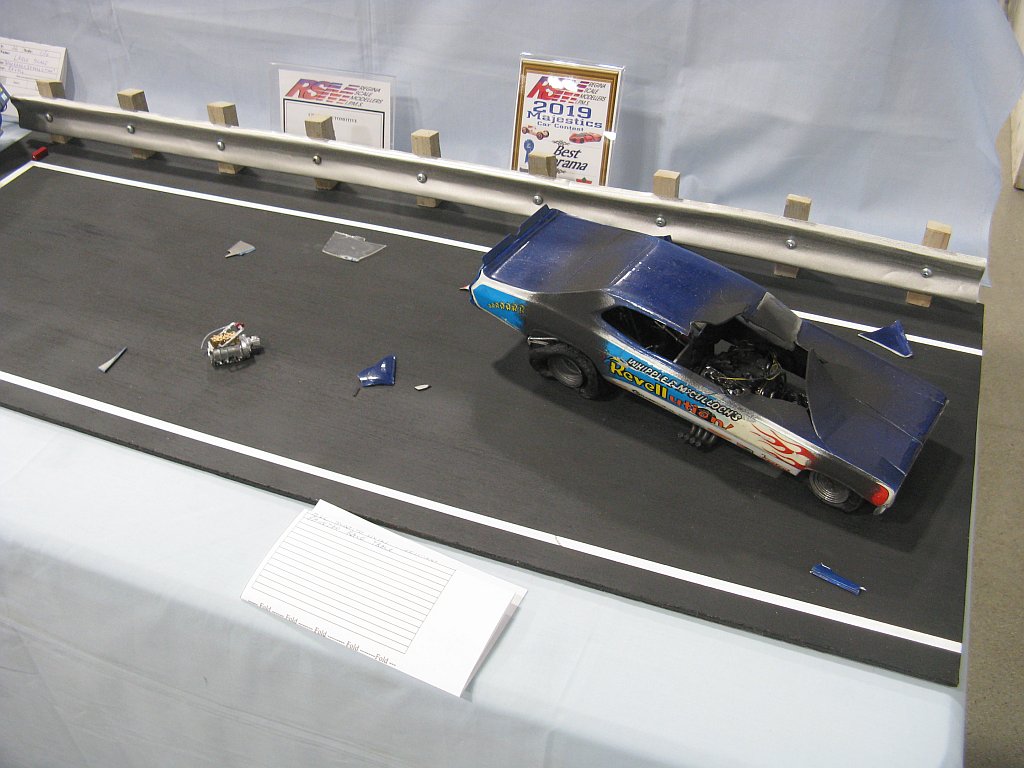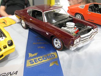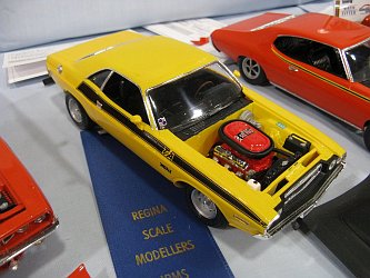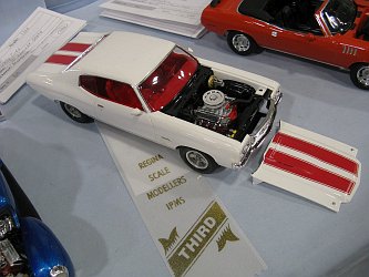 Category 16: Replica Stock 1st - Curfew James - 1966 Plymouth Satellite 2nd - Curfew James - 1964½ Mustang Convertible 3rd - Justin Antonowitsch - '57 Chrysler 300C Category 17: Street Modified & Pro Street 1st - Darin Wielgoz - '66 Chevelle Wagon 2nd - Darin Wielgoz - '70 Chevelle SS 454 3rd - Darin Wielgoz - '64 Ford Fairlane Category 18: Competition Open Wheel (1/20 and smaller) 1st - Al Magnus - Ford Model T Racer 2nd - Dave Kapp - 2 Engine Dragster 3rd - Dave Kapp - Streamliner Dragster Category 19: Competition Closed Wheel 1st - Ted McPherson - 1952 Hudson Hornet 2nd - Ted McPherson - Tony Stewart 'Peanuts' NASCAR Category 20: Custom & Show cars 1st - Dave Kapp - Bonneville Sportster 2nd - Dave Kapp - El Camino 3rd - Dave Kapp - Beverly Hillbillies Category 21: Street Rods 1st - Brent Welta - 1940 Ford Coupe 2nd - Brent Welta - '29 Ford Roadster 3rd - Brent Welta - '30 Ford Model A Coupe Category 23: Light Trucks 1st - Justin Antonowitsch - Ford Bronco 2nd - Justin Antonowitsch - GMC Pickup Category 26: Large Scales 1st - Roger McPherson - Shelby Cobra 427 2nd - Dale Anderson - "Mongoose" Rail Dragster 3rd - Roger McPherson - 1931 Ford Model A Roadster Category 27: Muscle cars 1st - Darin Wielgoz - '70 Boss 429 Mustang 2nd - Darin Wielgoz - '70 Challenger T/A 3rd - Darin Wielgoz - '70 Chevelle SS 454 Category 41: Dioramas (all scales) 1st - Dale Anderson - "RRRRRRRR Revellution" Category 46: Miscellaneous (all scales) 1st - Al Magnus - David Brown VIG1 Tractor 2nd - Al Magnus - Clark Clarktor 6 Tractor & trailer 3rd - Dave Kapp - 1971 Skidoo TNT 400