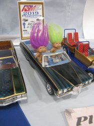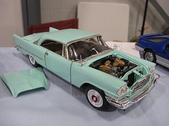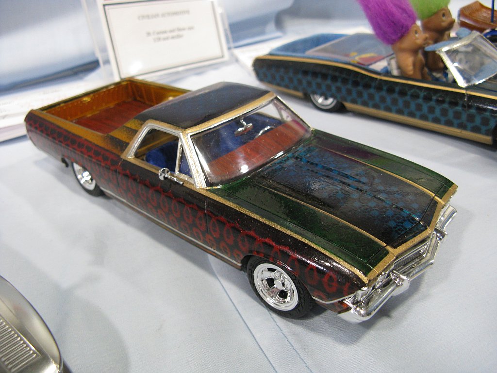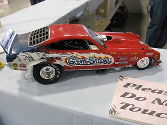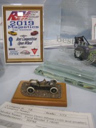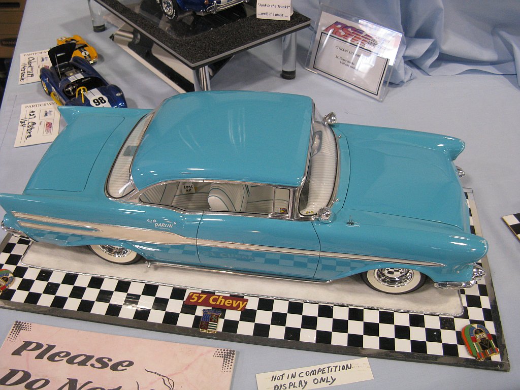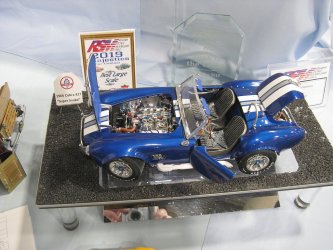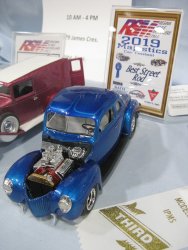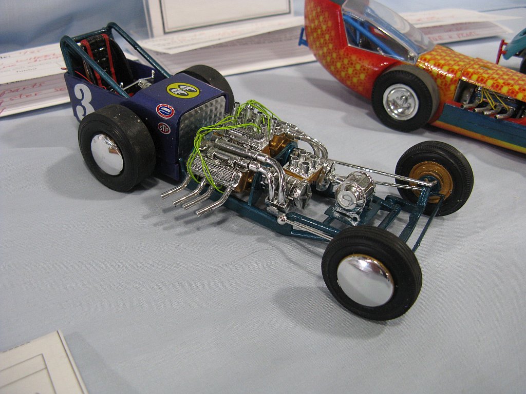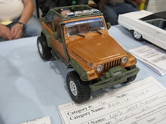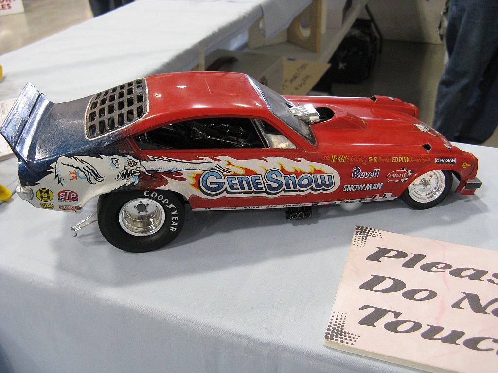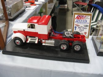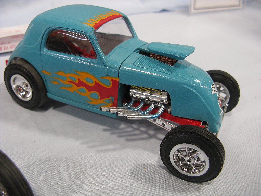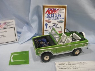 Category 16: Replica Stock 1st - Curfew James - 1966 Plymouth Satellite 2nd - Curfew James - 1964½ Mustang Convertible 3rd - Justin Antonowitsch - '57 Chrysler 300C Category 17: Street Modified & Pro Street 1st - Darin Wielgoz - '66 Chevelle Wagon 2nd - Darin Wielgoz - '70 Chevelle SS 454 3rd - Darin Wielgoz - '64 Ford Fairlane Category 18: Competition Open Wheel (1/20 and smaller) 1st - Al Magnus - Ford Model T Racer 2nd - Dave Kapp - 2 Engine Dragster 3rd - Dave Kapp - Streamliner Dragster Category 19: Competition Closed Wheel 1st - Ted McPherson - 1952 Hudson Hornet 2nd - Ted McPherson - Tony Stewart 'Peanuts' NASCAR Category 20: Custom & Show cars 1st - Dave Kapp - Bonneville Sportster 2nd - Dave Kapp - El Camino 3rd - Dave Kapp - Beverly Hillbillies Category 21: Street Rods 1st - Brent Welta - 1940 Ford Coupe 2nd - Brent Welta - '29 Ford Roadster 3rd - Brent Welta - '30 Ford Model A Coupe Category 23: Light Trucks 1st - Justin Antonowitsch - Ford Bronco 2nd - Justin Antonowitsch - GMC Pickup Category 26: Large Scales 1st - Roger McPherson - Shelby Cobra 427 2nd - Dale Anderson - "Mongoose" Rail Dragster 3rd - Roger McPherson - 1931 Ford Model A Roadster Category 27: Muscle cars 1st - Darin Wielgoz - '70 Boss 429 Mustang 2nd - Darin Wielgoz - '70 Challenger T/A 3rd - Darin Wielgoz - '70 Chevelle SS 454 Category 41: Dioramas (all scales) 1st - Dale Anderson - "RRRRRRRR Revellution" Category 46: Miscellaneous (all scales) 1st - Al Magnus - David Brown VIG1 Tractor 2nd - Al Magnus - Clark Clarktor 6 Tractor & trailer 3rd - Dave Kapp - 1971 Skidoo TNT 400